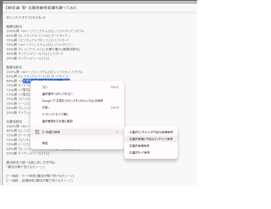 選択した文字を右クリックし、ラグナロクオンラインファンサイトのビー物語で検索します。