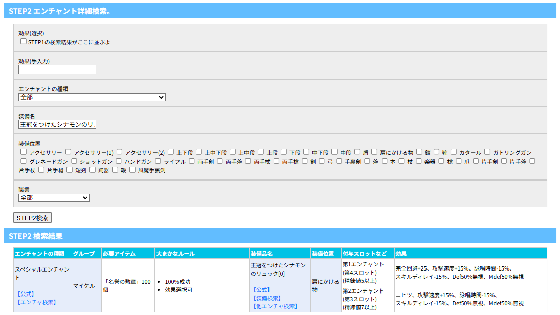 - ②選択装備に可能なエンチャント検索